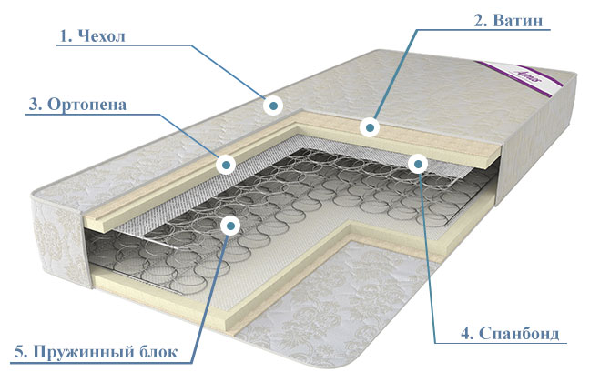 - Спанбонд. Современный нетканый материал высокой прочности используется как прокладочный слой между пружинным блоком и ортопеной. Из-за своей прочности на разрыв и истирание выдерживает воздействие металлических пружин и сохраняет от деформации слой ортопены.