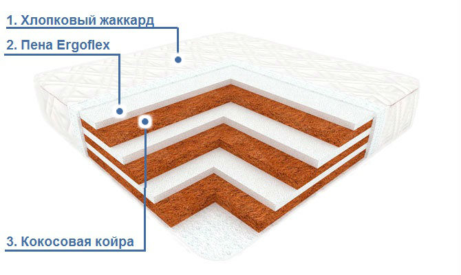 2. Пена Ergoflex (3 см). Упругий, эластичный материал выполняет роль изоляционного слоя, смягчает поверхность матраса, предотвращает износ кокосовых плит. Искусственный латекс обладает хорошей воздухопроницаемостью, антистатичный и гипоаллергенный. Именно данный материал придает комфорт матрасу, сохраняя при этом его ортопедические свойства на высоком уровне.