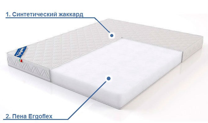 1. Чехол Есо (2 см). Для защиты наполнителя матраса используется качественная ткань для обивки — синтетический жаккард (состав 50% полиэстер / 50% пропилен). Несъемный чехол, стеганный с файбером, служит также дополнительным слоем для смягчения основы. Кроме того, он помогает сохранить тепло в холоднее время.