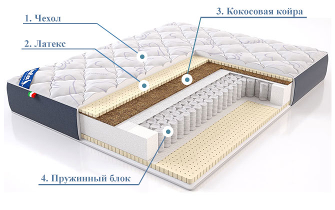 - Блок независимых пружин. Повторяет линии вашего тела и гарантирует правильное положение позвоночника во время сна. Наполнители естественного происхождения – кокосовая койра и латекс – слажено работают с пружинами и делают отдых максимально комфортным.