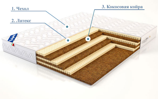 3. Кокосовая койра ( 2 см — 2 слоя, 1 см — 1 слой). Наполнитель, пропитанный латексом в 50% пропорции, создает жесткую и упругую поверхность. Нагрузка оптимально распределяется по всему матрасу, за счет чего мышцы и суставы отдыхают правильно. Хорошая воздухопроницаемость позволяет защитить матрас от пыли, внутри изделия не задерживаются вредоносные микробы и не развиваются грибки. Матрас защищен, а значит защищены ваш сон и здоровье.